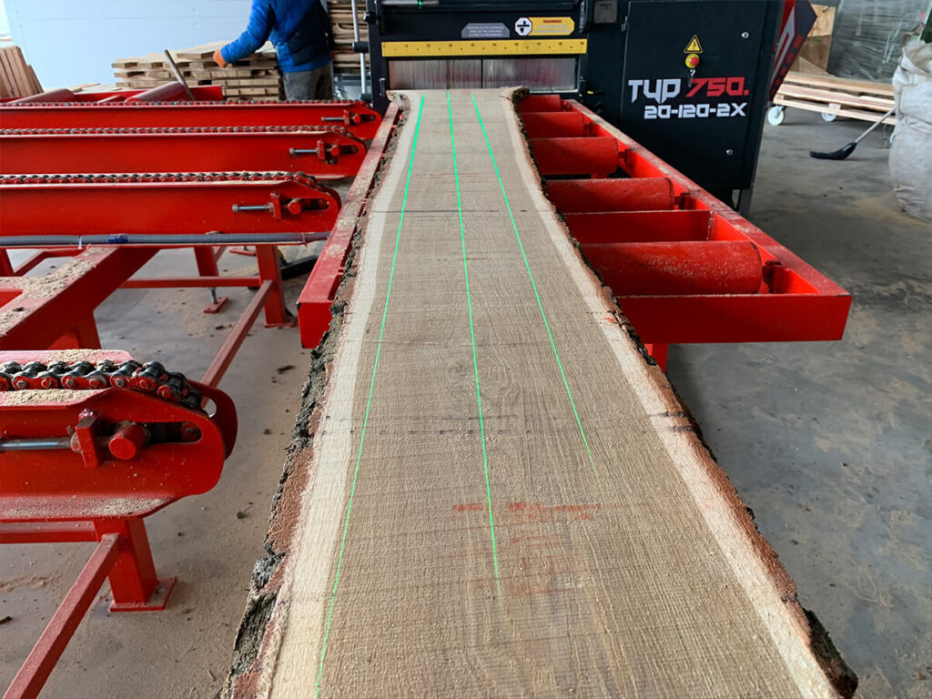 Dank unserer Vielblattsäge, deren Blätter elektrisch verstellbar sind, können wir 3 Schnitte gleichzeitig ausführen. Dadurch erreichen wir eine hervorragende Qualität und hohe Effizienz.